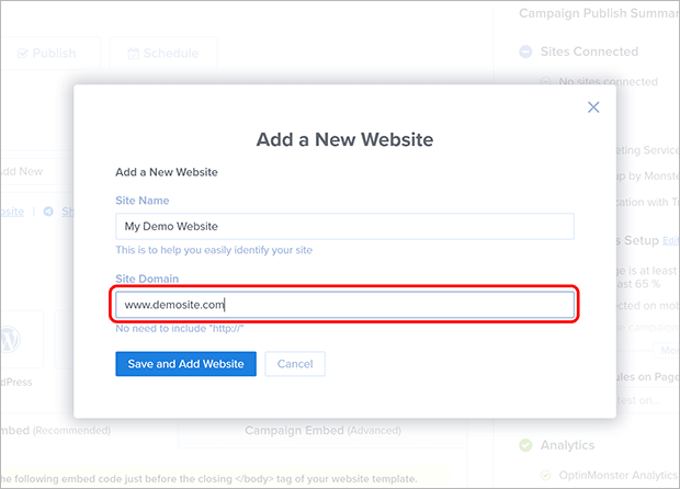 Enter your site name and domain. After you do that, click Save and Add Website.