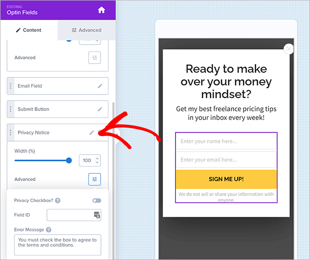OptinMonster even has built-in GDPR tools so you can create compliant responsive forms with just a few clicks. Click on your Optin Fields and scroll down to the Privacy Notice options. Click on Advanced to customize your GDPR consent settings.